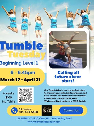 New Tumble classes starting now! STUNT CLINIC April 13th